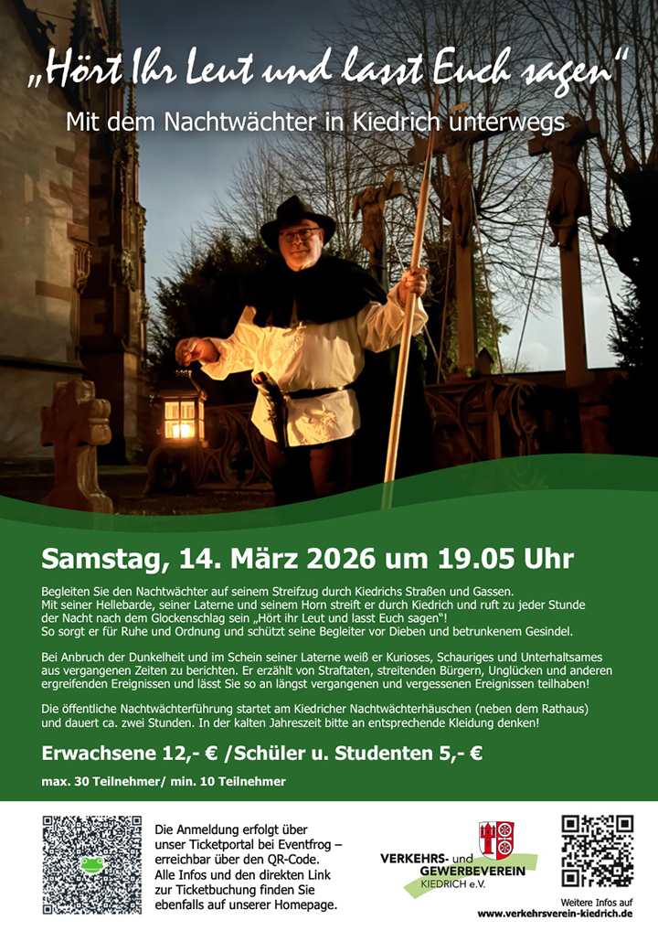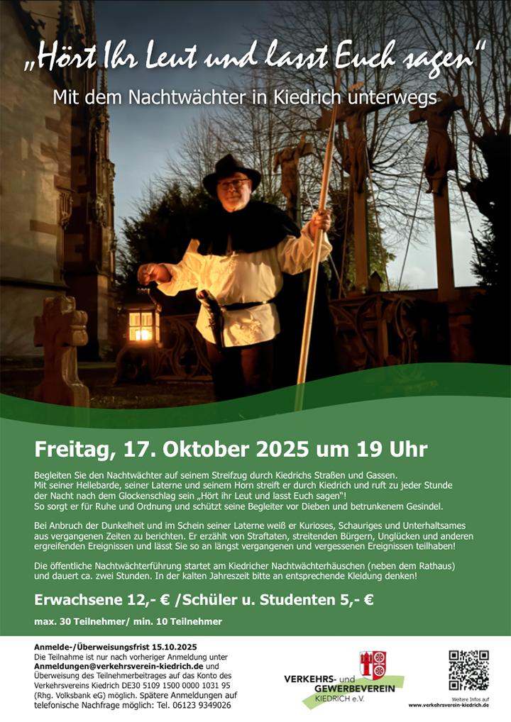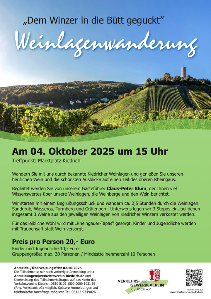 Das kleine Weindorf Kiedrich blickt auf eine über 1000-jährige Geschichte zurück. Hier pflegt und bewahrt man Traditionen und ist Neuem gegenüber aufgeschlossen. Neben dem Fremdenverkehr und der Wallfahrt waren der Weinbau und das nahe gelegene Kloster Eberbach seit dem Mittelalter die Fundamente für den Wohlstand und die Gastgeberqualitäten der Kiedricher Bürger.